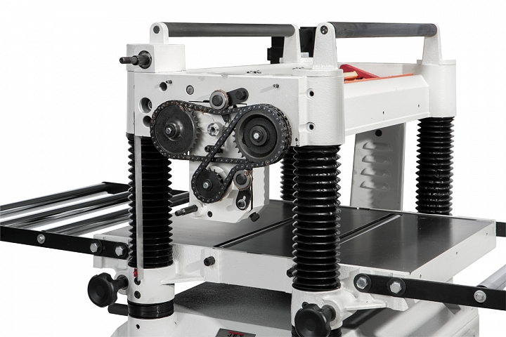 Jet JWP-208-3 — мощный и производительный рейсмусовый станок профессионального класса для частных мастерских с большими объёмами работ и для поточного производства на промышленных предприятиях. Массивная (300 кг), устойчивая и жёсткая конструкция имеет стандартную для среднеразмерных станков компоновку: строгальный узел с мотором и механизмом подачи закреплён неподвижно. Для регулировки просвета и, соответственно, толщины снимаемого слоя стол перемещается по четырём колоннам. «Лифт» производится вращением маховика с рукояткой, после регулировки положение стопорится винтовыми зажимами. С верхней стороны моторного модуля есть вальцы для обратной подачи заготовки. Ролики в поверхности стола, снижающие трение заготовки, установлены на эксцентриковых осях для простой и удобной регулировки выступа над его уровнем.